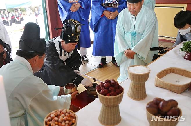 [증평=뉴시스] 강신욱 기자 = 이재영 충북 증평군수가 3일 증평단군전에서 봉행된 단기 4355년 개천대제에서 초헌관을 맡아 분향하고 있다. 2022.10.03. ksw64@newsis.com