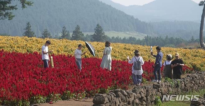 [서귀포=뉴시스] 오영재 기자 = 개천절인 3일 오전 서귀포시 표선면 성읍리 한 농원에서 관광객들이 맨드라미 꽃밭을 걸으며 사진을 찍고 있다. 2022.10.03. oyj4343@newsis.com