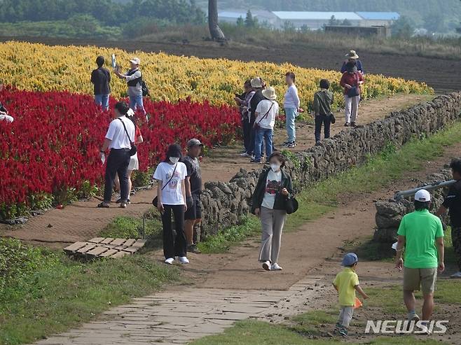 [서귀포=뉴시스] 오영재 기자 = 3일 오전 서귀포시 표선면 성읍리 한 농원을 찾은 관광객들이 맨드라미 꽃밭을 걷고 있다. 2022.10.03. oyj4343@newsis.com