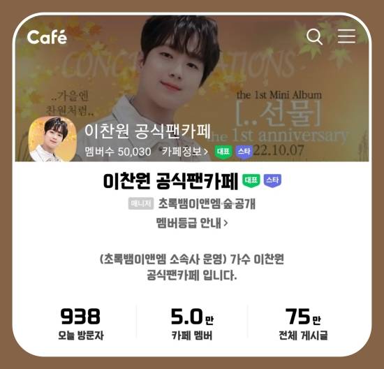 트로트 가수 이찬원의 공식 팬카페 '찬스'의 회원수가 5만 명을 돌파했다.