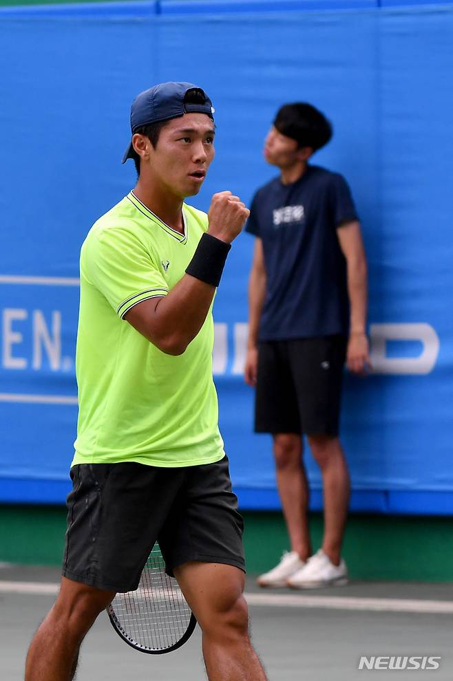 [광주=뉴시스] 이영주 기자 = 3일 오전 광주 남구 진월국제테니스장에서 열린 2022 광주오픈 국제 남자 챌린저테니스대회 예선, 이덕희 선수가 스미스 키건(미국) 선수와 경기 도중 득점 후 세리머니를 하고 있다. 2022.10.03. leeyj2578@newsis.com
