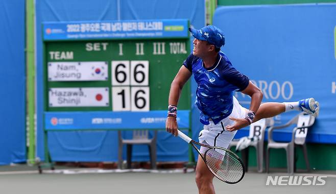 [광주=뉴시스] 이영주 기자 = 3일 오전 광주 남구 진월국제테니스장에서 열린 2022 광주오픈 국제 남자 챌린저테니스대회 예선, 남지성 선수가 상대 하자와 신지 선수와의 2세트 동점 상태에서 서브를 날리고 있다. 2022.10.03. leeyj2578@newsis.com