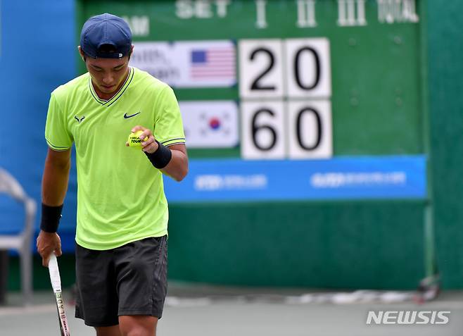 [광주=뉴시스] 이영주 기자 = 3일 오전 광주 남구 진월국제테니스장에서 열린 2022 광주오픈 국제 남자 챌린저테니스대회 예선, 이덕희 선수가 스미스 키건(미국) 선수와 경기 도중 서브를 준비하고 있다. 2022.10.03. leeyj2578@newsis.com