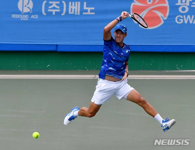 [광주=뉴시스] 이영주 기자 = 3일 오전 광주 남구 진월국제테니스장에서 열린 2022 광주오픈 국제 남자 챌린저테니스대회 예선, 남지성 선수가 상대 하자와 신지 선수의 공을 점프하며 받아내고 있다. 2022.10.03. leeyj2578@newsis.com