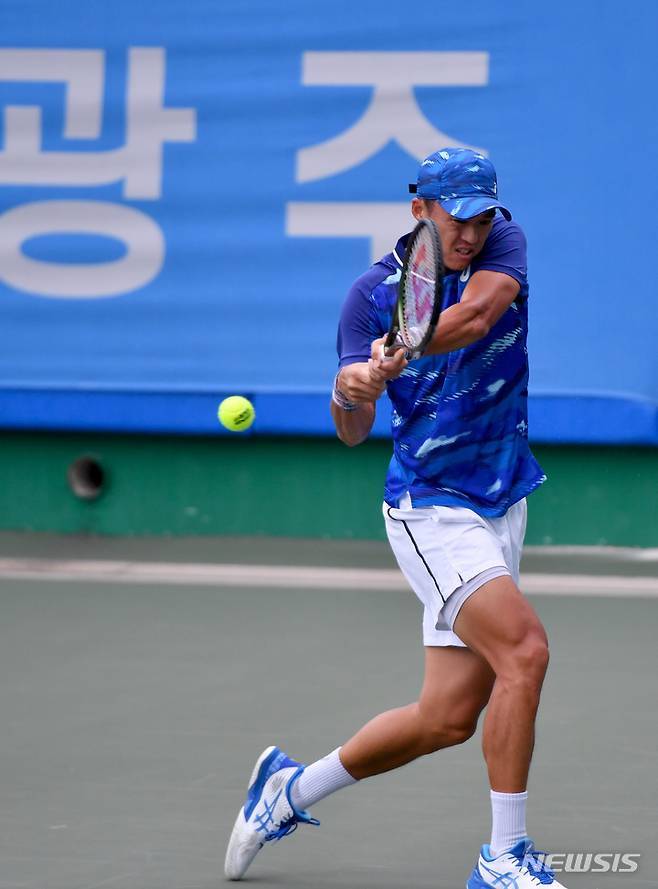 [광주=뉴시스] 이영주 기자 = 3일 오전 광주 남구 진월국제테니스장에서 열린 2022 광주오픈 국제 남자 챌린저테니스대회 예선, 남지성 선수가 상대 하자와 신지(일본) 선수의 공을 받아내고 있다. 2022.10.03. leeyj2578@newsis.com