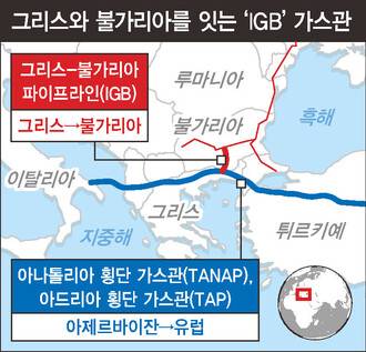 불가리아와 그리스를 잇는 가스관 ‘아이지비’(IGB)은 182km 길이로 오랜 기간 러시아산 가스에 의존해 온 불가리아의 에너지 수급 문제를 해결하기 위해 건설됐다. 지난 7월 공식 개통됐지만 운영되지 않다가 이날부터 가동에 들어갔다. 이 가스관 가동을 위해 2억4000만 유로(3390억원)가 투입됐다. 연간 최대 30억㎥ 물량의 가스 수송이 가능하다. 불가리아는 천연가스 수입량의 80%를 러시아에 의존해왔다.
