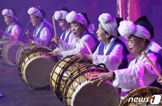 (서울=뉴스1) 송원영 기자 = 3일 서울 중구 장충체육관에서 서울문화재단 주최로 열린 제1회 서울생활예술페스티벌에서 성동구 풍각쟁이팀이 사물놀이 공연을 하고 있다.