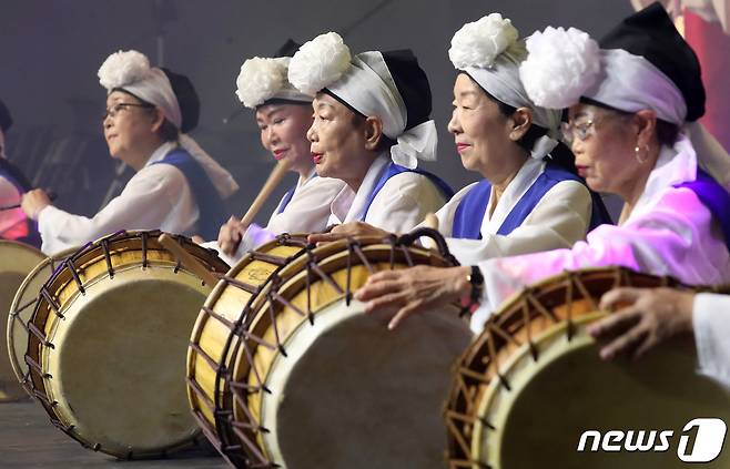 (서울=뉴스1) 송원영 기자 = 3일 서울 중구 장충체육관에서 서울문화재단 주최로 열린 제1회 서울생활예술페스티벌에서 성동구 풍각쟁이팀이 사물놀이 공연을 하고 있다.