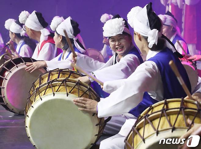 (서울=뉴스1) 송원영 기자 = 3일 서울 중구 장충체육관에서 서울문화재단 주최로 열린 제1회 서울생활예술페스티벌에서 성동구 풍각쟁이팀이 사물놀이 공연을 하고 있다.