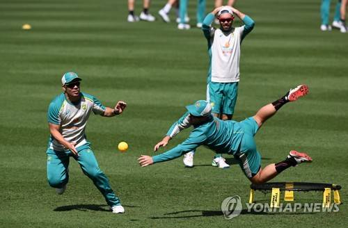 epa10220737 David Warner (L) looks on to Josh Inglis (R, bottom) during an Australian Cricket team training session at Metricon Stadium on the Gold Coast, Australia, 03 October 2022. EPA/DAVE HUNT AUSTRALIA AND NEW ZEALAND OUT