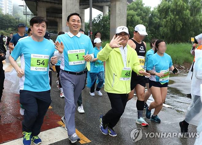 (서울=연합뉴스) 조성명 강남구청장(왼쪽 두 번째)이 3일 오전 서울 강남구 봉은사로 일대에서 열린 제19회 국제평화마라톤대회에 참가하고 있다. 2022.10.3 [강남구 제공. 재판매 및 DB 금지]
