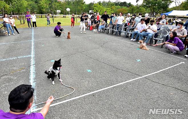 [대구=뉴시스] 이무열 기자 = '2022 반려동물한마당'이 열린 3일 오후 대구 북구 경북대학교 학생주차장에서 반려견과 보호자가 '기다려 대회'에 참여하고 있다. 2022.10.03. lmy@newsis.com