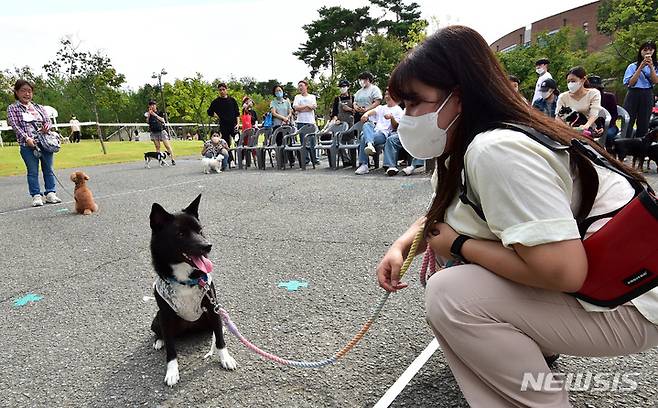 [대구=뉴시스] 이무열 기자 = '2022 반려동물한마당'이 열린 3일 오후 대구 북구 경북대학교 학생주차장에서 반려견과 보호자가 '기다려 대회'에 참여하고 있다. 2022.10.03. lmy@newsis.com
