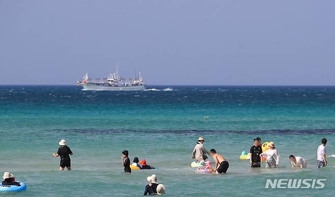 [제주=뉴시스] 우장호 기자 = 낮 최고기온이 30도에 육박하는 무더운 날씨를 보인 3일 오후 제주시 한림읍 협재해수욕장을 찾은 관광객들이 물놀이를 하며 더위를 식히고 있다. 2022.10.03. woo1223@newsis.com