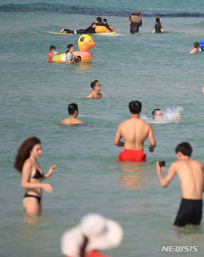 [제주=뉴시스] 우장호 기자 = 낮 최고기온이 30도에 육박하는 무더운 날씨를 보인 3일 오후 제주시 한림읍 협재해수욕장을 찾은 관광객들이 물놀이를 하며 더위를 식히고 있다. 2022.10.03. woo1223@newsis.com