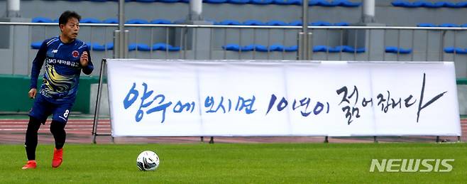 [양구=뉴시스] 김경목 기자 = 개천절 공휴일인 3일 오후 연예인 축구단 일레븐FC(구단주 이덕화) 올림픽 유도 금메달리스트 김재엽 동서울대 교수가 강원도 양구군 종합운동장에서 열린 '제10회 뉴시스 강원 청춘양구 시니어배 전국 동호인클럽 축구대회' 10주년 기념 초청 친선경기에서 공을 받아줄 동료를 찾고 있다. 2022.10.03. photo31@newsis.com