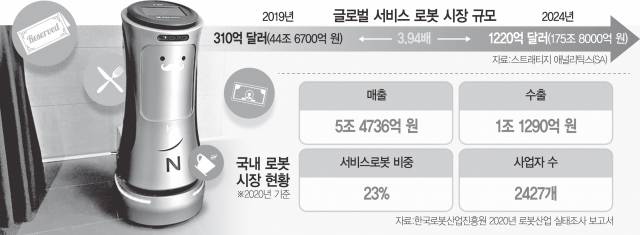 기업들도 서비스로봇 생산에 속도를 내고 있다. LG전자는 2017년 인천국제공항에 LG 클로이 가이드봇 도입을 시작으로 서브봇·바리스타봇·셰프봇·캐리봇 등을 운영하고 있다. 수출 성과도 나타나고 있다. 한국로봇산업진흥원에 따르면 2020년 국내 로봇 시장 규모는 5조 4736억 원으로 수출이 1조 1290억 원을 차지했다. 이미 조 원 단위의 수출산업이 된 셈이다.