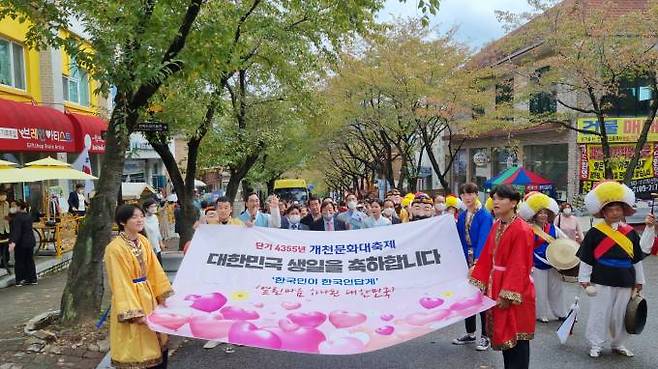 기념식에 이어진 거리 퍼레이드에는 국조 단군으로 분장하고, 지역주민들과 함께 개천절을 경축하고 홍익인간 정신을 알리는 시간을 가졌다.