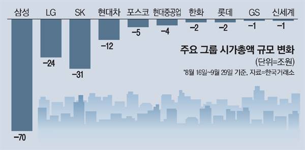 3일 한국거래소에 따르면 '베어마켓 랠리'(약세장 속 반등)가 끝난 이후 증시가 급락한 한 달 반(8월 중순~9월 말) 동안 10대 그룹의 시가총액은 1190조6360억원에서 1037조2365억원으로 12.9% 감소했다. 한 달 반 새 153조3994억원이 증발했다. 4대 그룹(삼성·LG·SK·현대차) 기준으로는 1059조1759억원에서 922조2908억원으로 136조8851억원(12.9%)이 사라졌다.