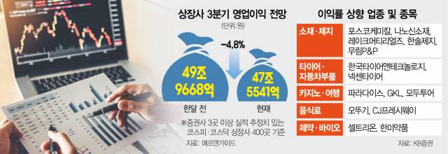 ◇한 달 만에 이익 눈높이 5%↓···삼전 11.8% 하향=3일 금융 정보 업체 에프앤가이드에 따르면 올해 3분기 기준 상장사 400곳의 영업이익 추정치는 47조 5541억 원으로 집계됐다. 전년 동기 대비(53조 1055억 원)로는 10.4% 감소했다. 특히 한 달 전 추정치(49조 9668억 원) 대비로는 4.8%나 감소했다.