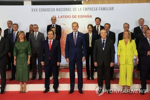 epa10220888 Spanish King Felipe VI (C) poses next to Extremadura's region president Guillermo Fernandez Vara (2-L), Education minister Pilar Alegria (L) and Familiar Company School President, Andres Sendagorta (3-R) during the 25th Familiar Company National Congress held in Caceres, Spain on 03 October 2022. EPA/ZIPI