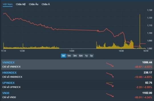 벤치마크 VN지수는 전 거래일에 비해 45.67p(4.03%) 급락한 1,086.44p로 장을 마쳤고 36개 종목이 상승, 326개 종목이 하락했다.
