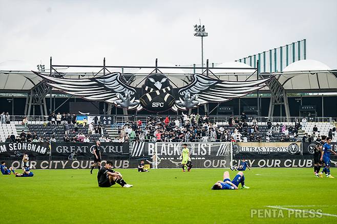 [ 펜타프레스 - 2022/10/03 ] 경기 종료 후 최선을 다 한 선수들이 그라운드에 쓰러져 있다.