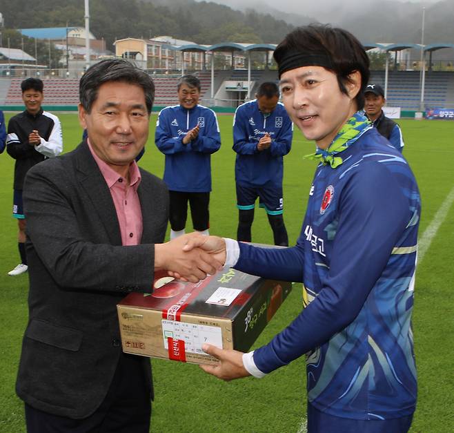 [양구=뉴시스] 김경목 기자 = 3일 오후 강원 양구군 종합운동장에서 '제10회 뉴시스 강원 청춘양구 시니어배 전국 동호인클럽 축구대회' 10주년 기념 연예인 축구단 일레븐FC(구단주 이덕화) 초청 친선경기가 열린 가운데 환영식에서 서흥원 양구군수가 최수종 단장에게 양구사과를 선물하고 있다. (사진=에스엠액티브(유) 제공) 2022.10.03. photo@newsis.com