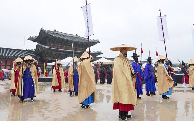 전국의 수문장들이 가을비가 내린 3일 서울 종로구 경복궁에서 수문장 임명의식을 진행하고 있다. 전국 수문장 240여명은 경복궁 수문장 교대의식 20주년을 맞아 이번 행사에 참여했다.