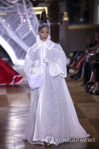 Cindy Bruna wears a creation for the Thom Browne ready-to-wear Spring/Summer 2023 fashion collection presented Monday, Oct. 3, 2022 in Paris. (Photo by Vianney Le Caer/Invision/AP) 092722128427, 21334631,