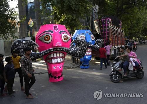 Effigies of mythical demon king Ravana are loaded onto a truck ahead of the Dusherra festival in New Delhi, Monday, Oct. 3, 2022. Hindu festival Dusherra commemorates the triumph of Lord Rama over the demon king Ravana, marking the victory of good over evil. (AP Photo/Manish Swarup)(