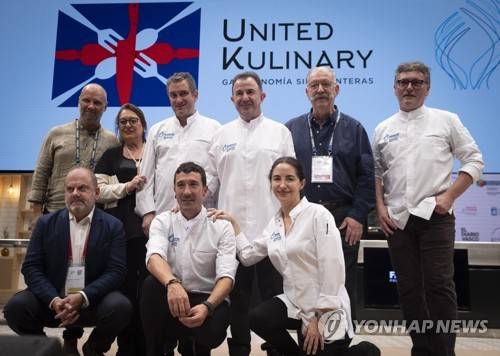 epa10221174 Chefs (back) Simon Rogan (L), Mikel Mayan (3-L), Martin Berasategi (3-R), Pedro Subijana (2-R), Andoni Luis Aduriz (R), (front) Eneko Atxa (C) and Elena Arzak (R) pose during the opening of the Gastronomika congress in San Sebastian, Spain, 03 October 2022. The 24th edition of the gastronomic congress runs from 02 to 05 October 2022. EPA/Javier Etxezarreta