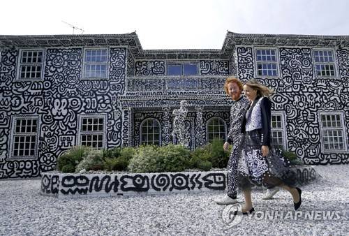British artist Sam Cox, aka Mr Doodle and his wife Alena, walk past the Doodle House, a twelve-room mansion, in Tenterden, which has been covered, inside and out in the artist's trademark monochrome, cartoonish hand-drawn doodles, in Kent, England, Monday, Oct. 3, 2022. (Gareth Fuller/PA Wire/PA via AP) UNITED KINGDOM OUT; NO SALES; NO ARCHIVE; PHOTOGRAPH MAY NOT BE STORED OR USED FOR MORE THAN 14 DAYS AFTER THE DAY OF TRANSMISSION; MANDATORY CREDIT