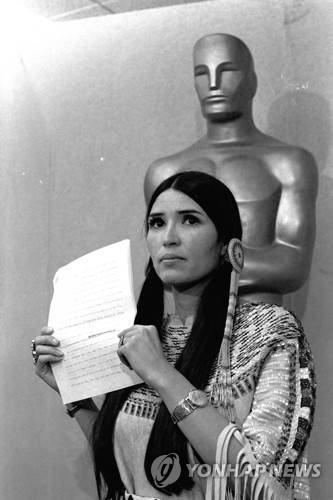 FILE - Sacheen Littlefeather, a Native American activist, tells the audience at the Academy Awards ceremony in Los Angeles, March 27, 1973, that Marlon Brando was declining to accept his Oscar as best actor for his role in "The Godfather." Sacheen Littlefeather died Sunday, Oct. 2, 2022, at her home in Marin County, Calif. She was 75. (AP Photo/File) FILE PHOTO