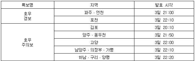 호우주의보 발령 / 3일 22:20 발표 / 3일 22:20 발효 / 하남, 구리, 양평