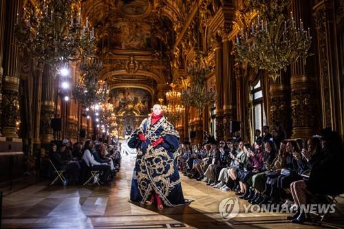 epa10221211 A model presents a creation from the Spring/Summer 2023 Ready to Wear collection by US designer Thom Browne during the Paris Fashion Week, in Paris, France, 03 October 2022. The presentation of the Women's collections runs from 26 September to 04 October. EPA/CHRISTOPHE PETIT TESSON