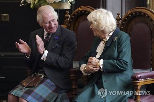 Britain's King Charles III and Camilla, the Queen Consort, attend an official council meeting at the City Chambers in Dunfermline, Fife, to formally mark the conferral of city status on the former town. (Andrew Milligan/PA via AP) UNITED KINGDOM OUT; NO SALES; NO ARCHIVE; PHOTOGRAPH MAY NOT BE STORED OR USED FOR MORE THAN 14 DAYS AFTER THE DAY OF TRANSMISSION; MANDATORY CREDIT