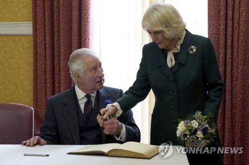 Britain's King Charles III and Camilla, the Queen Consort, sign the visitors book as they attend an official council meeting at the City Chambers in Dunfermline, Fife, to formally mark the conferral of city status on the former town. (Andrew Milligan/PA via AP) UNITED KINGDOM OUT; NO SALES; NO ARCHIVE; PHOTOGRAPH MAY NOT BE STORED OR USED FOR MORE THAN 14 DAYS AFTER THE DAY OF TRANSMISSION; MANDATORY CREDIT