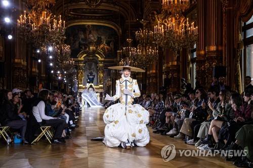 epa10221229 French model Cindy Bruna presents a creation from the Spring/Summer 2023 Ready to Wear collection by US designer Thom Browne during the Paris Fashion Week, in Paris, France, 03 October 2022. The presentation of the Women's collections runs from 26 September to 04 October. EPA/CHRISTOPHE PETIT TESSON