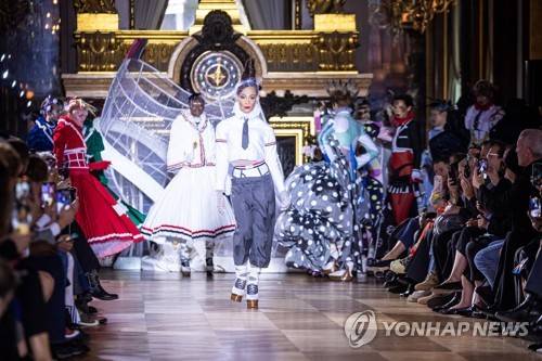 epa10221234 French model Cindy Bruna (C) presents a creation from the Spring/Summer 2023 Ready to Wear collection by US designer Thom Browne during the Paris Fashion Week, in Paris, France, 03 October 2022. The presentation of the Women's collections runs from 26 September to 04 October. EPA/CHRISTOPHE PETIT TESSON