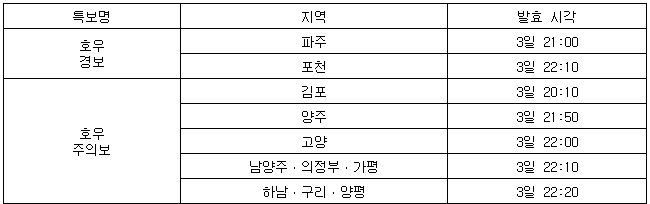 호우주의보 해제 / 3일 23:00 발표 / 3일 23:00 발효 / 동두천