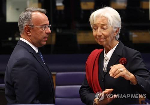 epa10221239 Christine Lagarde, president of the European Central Bank (ECB) (L) and Greek Finance Minister Christos Staikouras (R) at the start of an Eurogroup meeting in Luxembourg, 03 October 2022. Ministers will discuss the macroeconomic situation in the euro area. EPA/JULIEN WARNAND