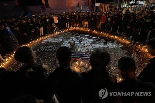 Supporters of soccer club Arema FC pray for the victims of Saturday's soccer match stampede outside the Kanjuruhan Stadium in Malang, Indonesia, Monday, Oct. 3, 2022. Panic at an Indonesian soccer match Saturday left over 100 people dead, most of whom were trampled to death after police fired tear gas to stop the violence. (AP Photo/Achmad Ibrahim)