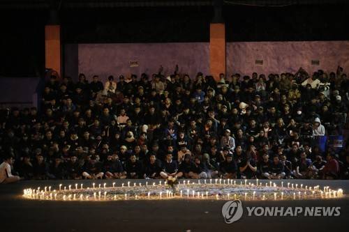 Supporters of soccer club Arema FC pray for the victims of Saturday's soccer match stampede outside the Kanjuruhan Stadium in Malang, Indonesia, Monday, Oct. 3, 2022. Panic at an Indonesian soccer match Saturday left over 100 people dead, most of whom were trampled to death after police fired tear gas to stop the violence. (AP Photo/Achmad Ibrahim)