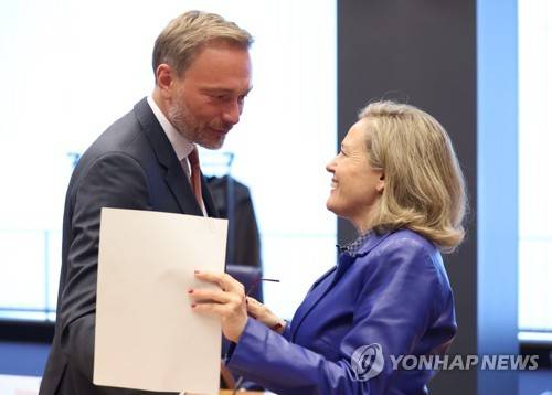 epa10221263 German Finance Minister Christian Lindner (L) and Spanish Economy Minister Nadia Calvino (R) at the start of an Eurogroup meeting in Luxembourg, 03 October 2022. Ministers will discuss the macroeconomic situation in the euro area. EPA/JULIEN WARNAND