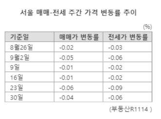 부동산R114에 따르면 지난 9월30일 기준 서울 아파트값은 0.04% 하락했다.