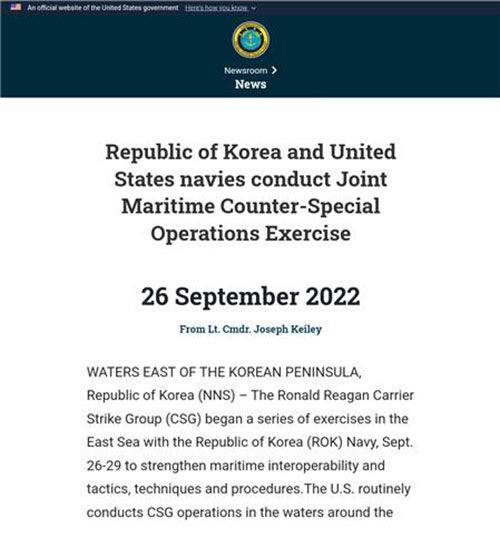 태평양 함대는 이보다 이틀 전인 9월 26일자 기사에서도 한국 해군과 미 해군이 대 특수전 훈련을 실시하고 있다는 소식을 전하면서 발생 장소를 '한반도 동쪽 수역'(WATERS EAST OF THE KOREAN PENINSULA)이라고 표기했습니다.