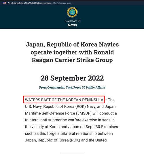 미 해군 태평양함대 홈페이지에 따르면 태평양함대는 지난 9월 28일자 자체 기사에서 9월 30일부터 진행한 한미일 3국의 연합 대잠훈련 계획을 알리면서 뉴스의 발생 장소를 '한반도 동쪽 수역'(WATERS EAST OF THE KOREAN PENINSULA)이라고 표기했습니다.