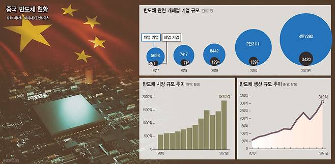 하지만 ‘통계적 착시’라는 반론도 만만찮다. 올 들어 폐업이 급증했지만, 그보다 더 많은 창업이 이뤄졌기 때문이다. 중국의 반도체 관련 창업 기업 수는 2019년 8442개, 2020년 2만3111개에서 지난해 4만7392개로 껑충 뛰었다. 올해 창업 기업 수는 아직 공개되지 않았지만, 작년과 비슷하거나 늘어났을 것으로 보인다. 지난해 현재 중국 내 반도체 관련 기업은 12만4천개에 이른다. 고영화 베이징대 한반도연구소 연구원은 “폐업하는 기업의 숫자가 느는 것은 맞지만, 이는 새로 생긴 기업이 많았기 때문”이라며 “올해 중국의 전체 벤처캐피털 투자에서 반도체가 차지하는 비중도 1위로 올라갔다”고 말했다.