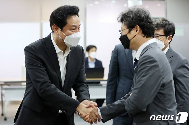 (서울=뉴스1) 조태형 기자 = 오세훈 서울시장이 4일 서울시청에서 열린 서울특별시 보건의료협의체 출범식에 앞서 참석자들과 인사를 나누고 있다.